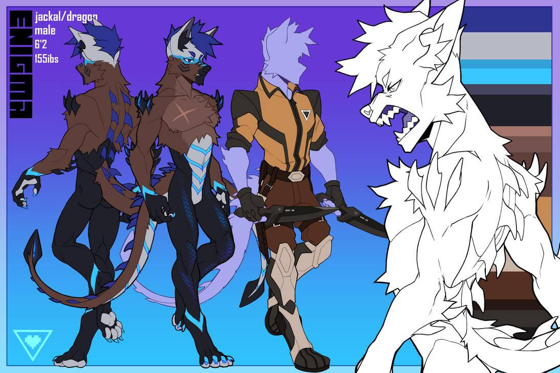 Enigma, origins of a desert planet, military family of a strict household. Originally a jackal that had seemed to find himself a way to learn the methodology of strategy. Grew up very quiet as an outsider within the academy however excelled in his studies to be the top of the squadron in the ROTC. Summa Cum Laude for the military academy where he found himself in love with his husband to be by his senior year of the academy with another one of his squadron mates.Both after their duties stationed within different reaches of the sectors, the husband had died prior to his return from one of his missions, tearing Enigma to pieces, causing him despair. Reinforcing his timid personality as well as causing him to never forgive himself for not being enough to prevent the crash from happening.Under Star Wagon, he joined along side Captain Karnage where by the end of Karnage's service, Karnage has split into two spiritual forms, connecting himself to Enigma. The ongoing despair in his heart had caused his jackal pureblood to be intermixed with draconic power, shedding some of his fur from his lower body to reveal his scales. He has dark, spatial energy that allows for teleportation and manipulation in order for him to gather Intel from afar as well as teleport and hide footsteps.Though not many know too much about him as he keeps his feelings to himself as the memories are vivid as he holds onto his husband. He strives for getting things done in a diligent manner with objective centric goals. Specializes in long range weapons for assassination missions, silent take downs to sedate enemies as well as using his sharpened scales as well as light blades to cut through enemies, as well as martial art weapons and techniques he learned from the academy.